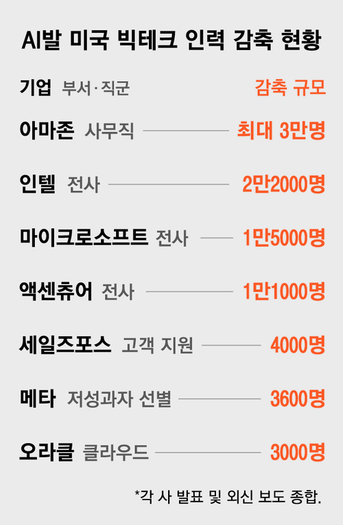 (출처: https://www.mk.co.kr/news/it/11453978 - 각 AI발 미국 빅테크 인력 감축 현황 표)