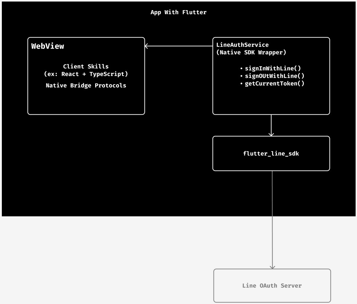 flutter_line_sdk 패키지를 사용하여 네이티브 레벨에서 OAuth를 처리하고, 결과를 WebView로 전달하는 아키텍처를 사용합니다.